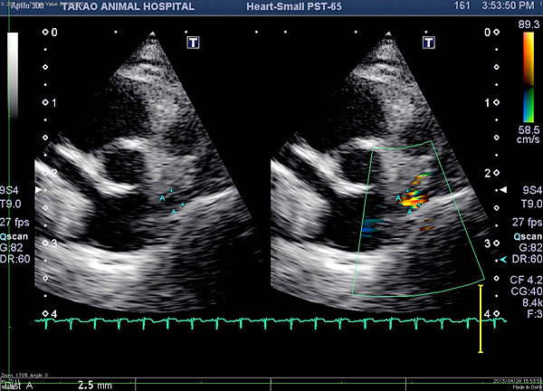 この症例は猫ですが、肥大型心筋症も合併していたため左心房圧の上昇によりエコー検査において心房中隔欠損が診断できた症例です。