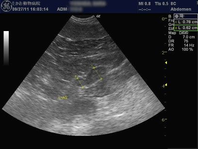 下記のエコー像は最近、当院にて副腎機能亢進症と診断した症例のものです。副腎の厚さが増加しているのが分かります。(特に右)